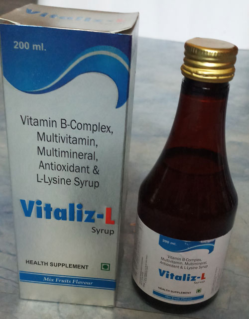 L - Lysine - 30 mg Nicotinamnide - 1.5 mg Vitamin E - 5 mg Vitamin B1 - 1.00 mg Vitamin B2 - 1.00 mg Vitamin B6 - 1.00 mg Vitamin A - 480 mcg Vitamin D3 - 5.00 mcg 200 IU Vitamin B12 - 0.50 mcg Zinc Sulphate - 8.00 mg Copper Sulphate - 0.75 mg Potassium Iodide - 50.00 mcg Form - 200 ml syrup
